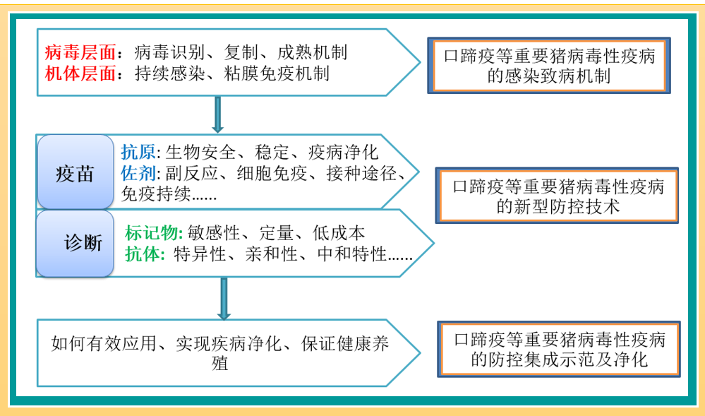 团队致力于口蹄疫、猪流行性腹泻、塞内卡、猪瘟、猪圆环等重要动物疫病防控技术的创新与应用,为口蹄疫等主要疾病的诊断检测、免疫防控和疾病进化提供技术支撑。目前的研究内容包括:(1)口蹄疫等重要猪病病原生态与致病机制研究:开展病原与宿主相互关系研究,探索主要猪病病原入侵、复制及传播的分子机制以及宿主免疫系统对病原识别和应答的分子机制。(2)口蹄疫等重要猪病防控技术的应用研究:以口蹄疫、猪流行性腹泻、猪圆环、猪瘟等重要疫病为对象,围绕优势抗原、纳米佐剂及载体、新型标记材料等功能性生物元件的研究内容,结合生物信息学、化学、材料学等交叉学科的方法,创制重要动物疫病安全、高效的新型基因工程疫苗及其配套的优势佐剂和载体递送系统,以及临床快速诊断新技术和战略储备诊断技术。(3)口蹄疫等重要动物疫病防控技术的示范应用:开展诊断监测、免疫防控的技术应用,完善生物安全防控体系,建立适合我国不同区域、规模养殖场的口蹄疫等重要动物疫病综合防控和疫病净化技术体系,提高动物疫病防控水平。 科研定位 基础研究:以口蹄疫病毒等重要病原为对象,研究病毒与宿主相互作用的生物学过程和机制病毒与宿主相互作用的生物学过程和机制,揭示病毒致病机理及宿主的应对机制。具体包括:开展口蹄疫病毒复制和致病的分子机制研究;开展口蹄疫黏膜免疫机制研究;开展口蹄疫持续性感染机制和区域净化理论研究与创新。 应用研究:以口蹄疫等病毒病的防控净化视角,针对当前疫苗及诊断等防控产品存在的科学问题,攻破核心关键技术,创制新型的优势功能制剂及产品,建立综合防控和疫病净化技术体系攻破核心关键技术,创制新型的优势功能制剂及产品,建立综合防控和疫病净化技术体系,提升口蹄疫防控水平。 组织结构 团队现有在岗职工19人,设首席1人、骨干4人,助理14人,其中研究员5人、副研究员5人、助理研究员8人、博士后1人;团队成员中拥有博士学位者15人,硕士学位者4人;博士生导师5名,硕士生导师8名;研究生和科研助理70余人。 团队现有国家级人才1人,科技部中青年科技创新领军人才1人,甘肃省拔尖领军人才1人,中国农业科学院创新型领军人才2人,甘肃省“555”创新人才1人。 项目支撑: 近年来,团队先后承担 “十三五”国家重点研发计划课题、“十四五”国家重点研发计划、国家自然科学基金面上项目及青年基金等国家级项目36项,甘肃省科技支撑计划项目、甘肃省重点研发项目、甘肃省自然基金兰州市重大专项等省市级项目15项。院所级项目35项,其他项目20余项。 成果支撑: 2016年以来,在Protein and cell、mBio、J Virol、J Immunol、Front immunol等期刊上共发表论文100余篇;授权专利80余项,其中国际发明专利10余项;团队获得一类新兽药证书2项,完成新兽药证书变更注册2项;4项产品获得临床批件,其中2项进入注册;2项产品进入临床前阶段;获得农业转基因安全证书4个。获甘肃省专利二等奖1项(2016年)、甘肃省专利一等奖2项(2018,2019年)、第二十届中国专利银奖1项(2018年)、甘肃省专利发明人奖1项(2020年)、中国农业科学院成果转化奖1项(2020年)、中国农业科学院十大成果奖1项(2022年)、获中国专利优秀奖(2022年)、中国农业科学院科技成果奖(2023年)、中国农业农村重大科技新成果奖1项(2023年)。