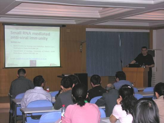 5月5日上午,王晖博士参观了寄生虫与虫媒疫病创新团队实验室及虫种资源保藏标本室,并与团队成员进行了座谈。首先刘光远研究员对寄生虫与虫媒疫病创新团队的组成及目前所开展的研究工作做了具体介绍。随后王晖博士就small RNA的研究前景,研究基础以及研究思路和大家进行了深入探讨,提出了许多建设性意见和建议。下午,在我所综合楼五楼会议室,由罗建勋副所长主持,王晖博士做了题为“Small RNA mediated anti-viral immunity”的专题演讲,受到了广大科研人员的热烈欢迎。王晖博士首先就高通量测序技术的发展革新做了系统阐述,介绍了二代测序(next-generation sequencing)的原理和技术特点。并就该技术在植物,动物机体中small RNA的获得以及新病毒的发现方面做了细致,清晰的讲解。演讲持续了约2个半小时,他渊博的知识、细致的工作、清晰的科研思路,获得了研究所科研工作者的一致好评。演讲结束后他还与大家就感兴趣的问题进行了热烈的现场交流。