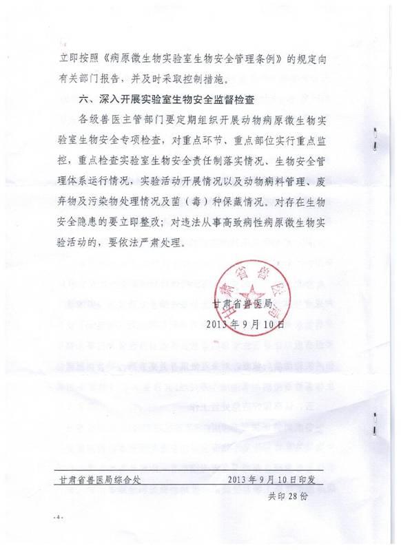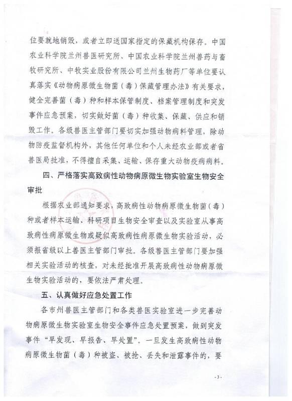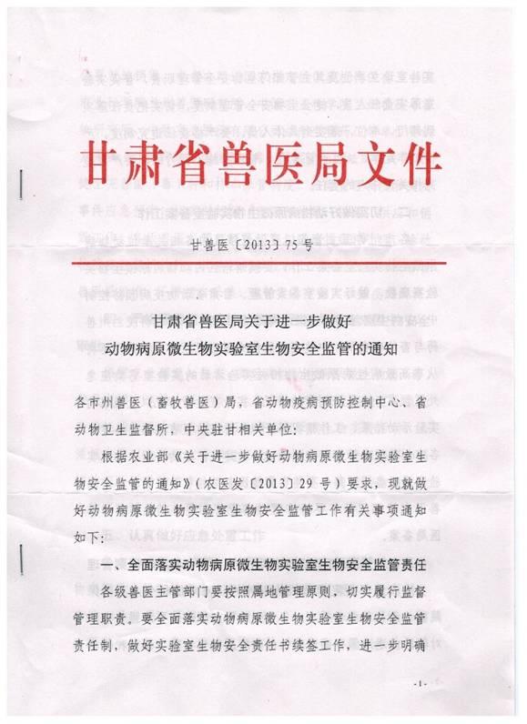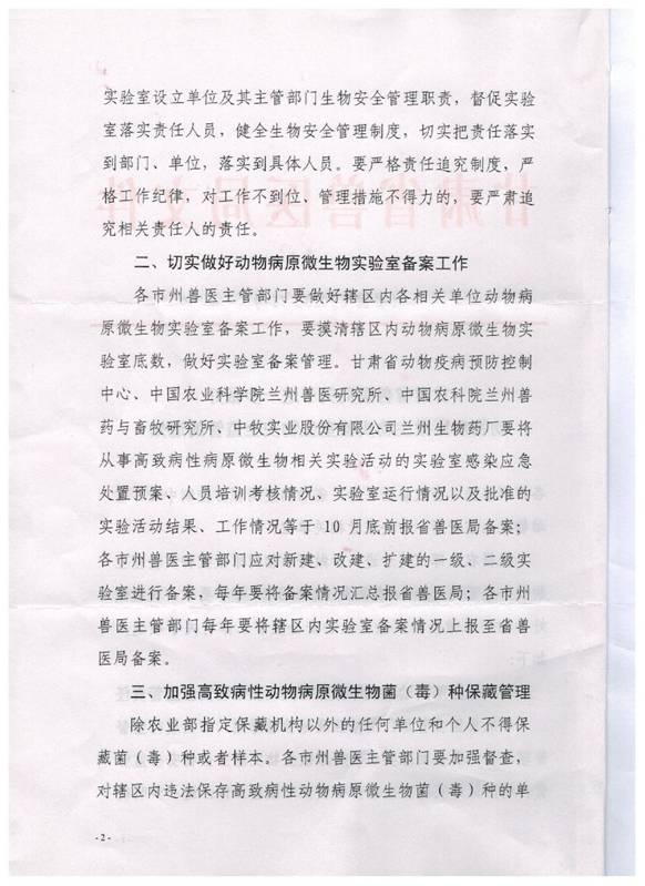 甘肃省兽医局关于进一步做好动物病原微生物实验室生物安全监管的通知
