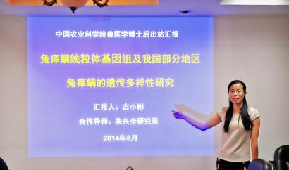 在出站报告会上,朱兴全研究员简要介绍了各位评审专家,介绍了古小彬博士后的基本情况及在站期间的科研工作情况。古小彬博士后汇报了《兔痒螨线粒体基因组及我国部分地区兔痒螨的遗传多样性研究》的主要进展及已取得的科研成果。随后,与会评审专家从项目选题、研究方法、数据分析、报告撰写等各方面对古小彬博士的研究工作进行了评价、提出了问题,古小彬博士一一做了回答。最后评审小组以一次性投票表决的方式对古小彬博士后在站期间的科研成果、个人表现等方面进行了综合评价,评价结果为优秀。