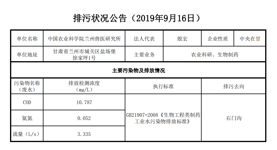 2019年9月12日污水排放监测数据公告