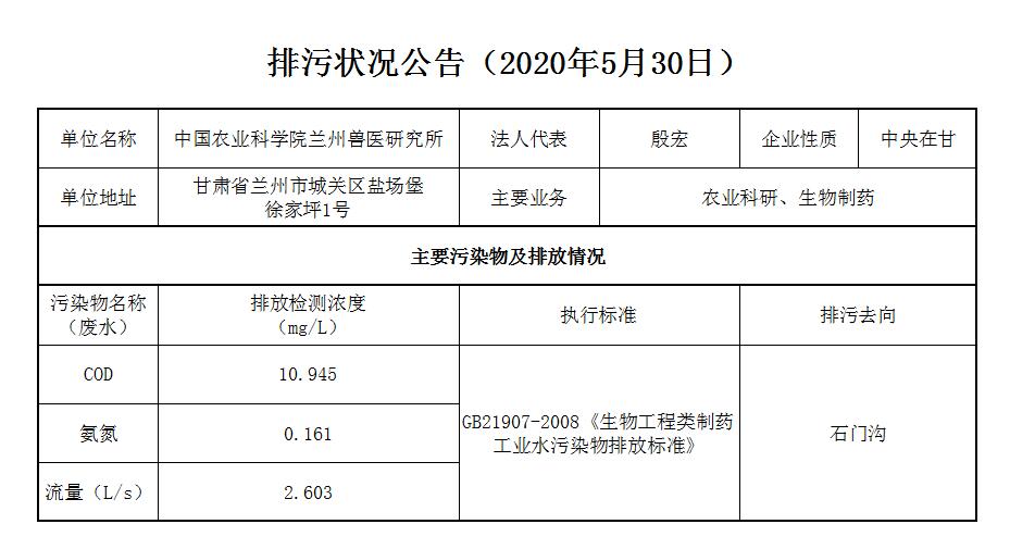 2020年5月30日污水排放监测数据公告