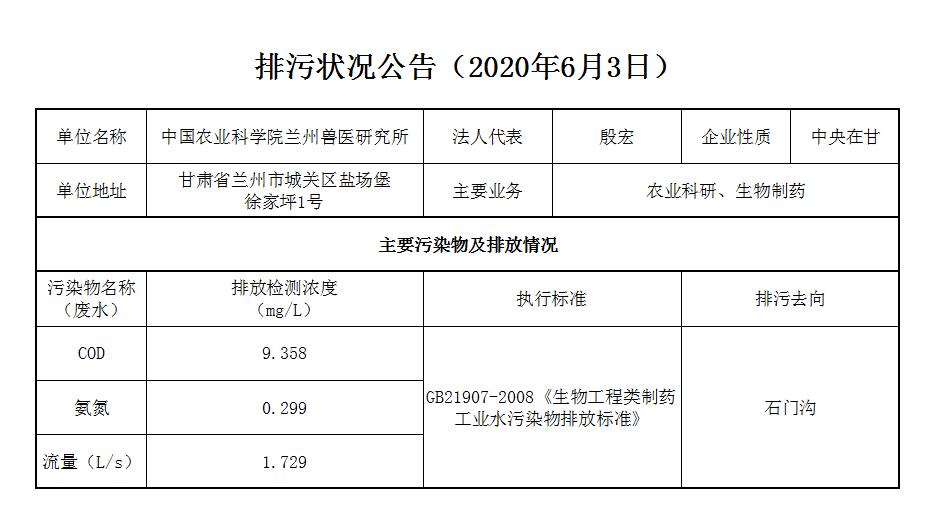 2020年6月3日污水排放监测数据公告