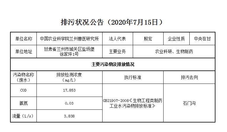 2020年7月15日污水排放监测数据公告