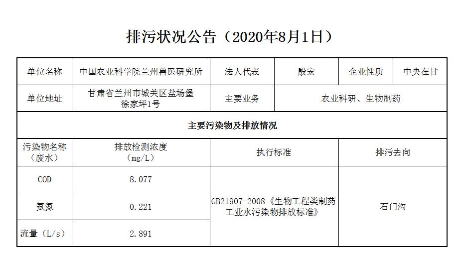 2020年8月1日污水排放监测数据公告