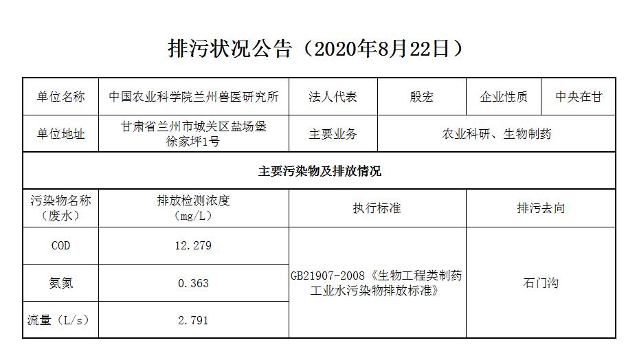 2020年8月22日污水排放监测数据公告