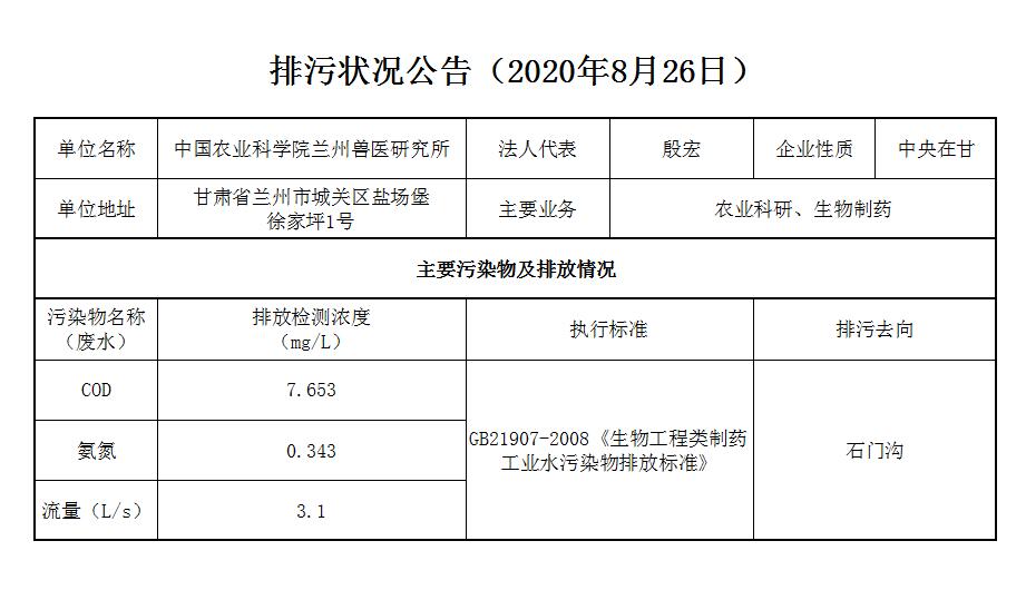 2020年8月26日污水排放监测数据公告