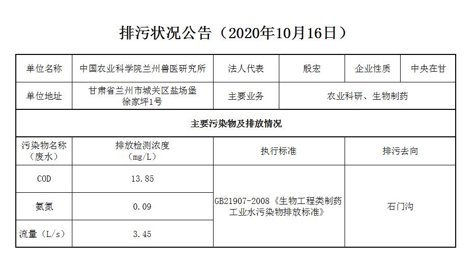 2020年10月16日污水排放监测数据公告