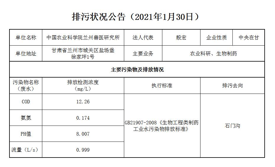 2021年1月30日污水排放监测数据公告