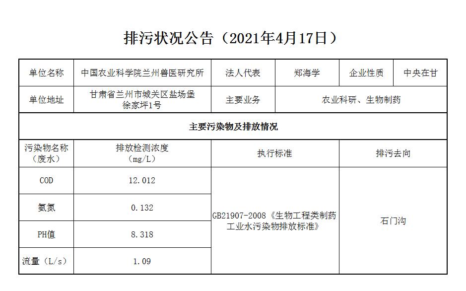 2021年4月17日污水排放监测数据公告