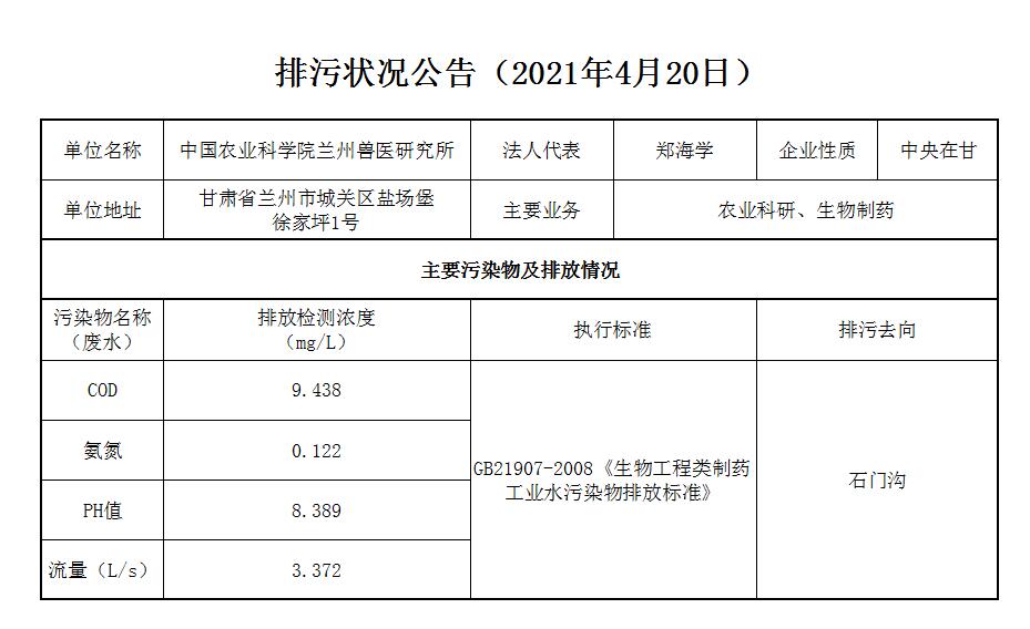 2021年4月20日污水排放监测数据公告