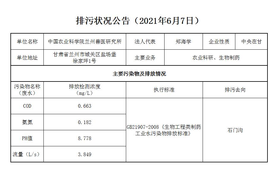 2021年6月7日污水排放监测数据公告