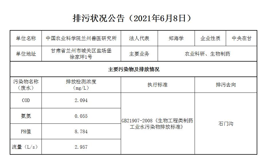 2021年6月8日污水排放监测数据公告