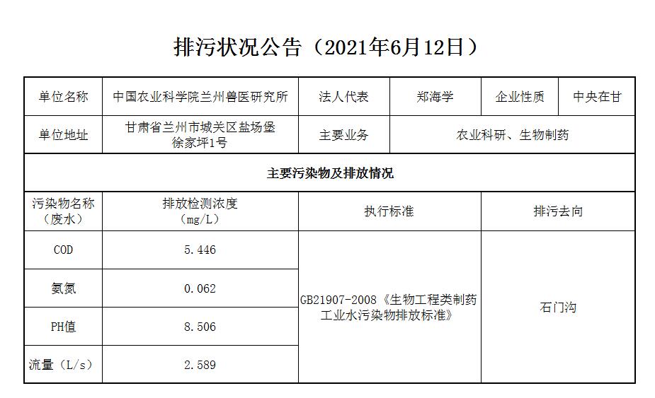 2021年6月12日污水排放监测数据公告