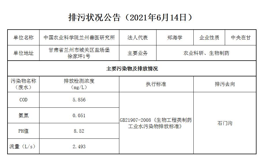 2021年6月14日污水排放监测数据公告