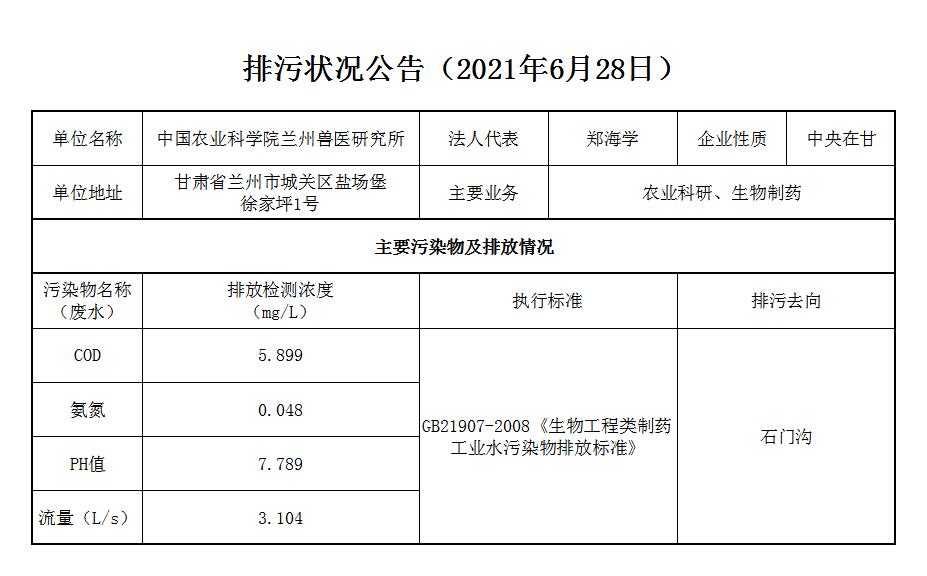 2021年6月28日污水排放监测数据公告