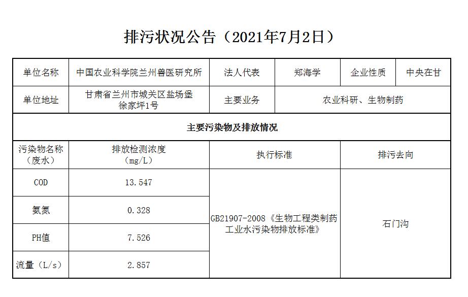 2021年7月2日污水排放监测数据公告