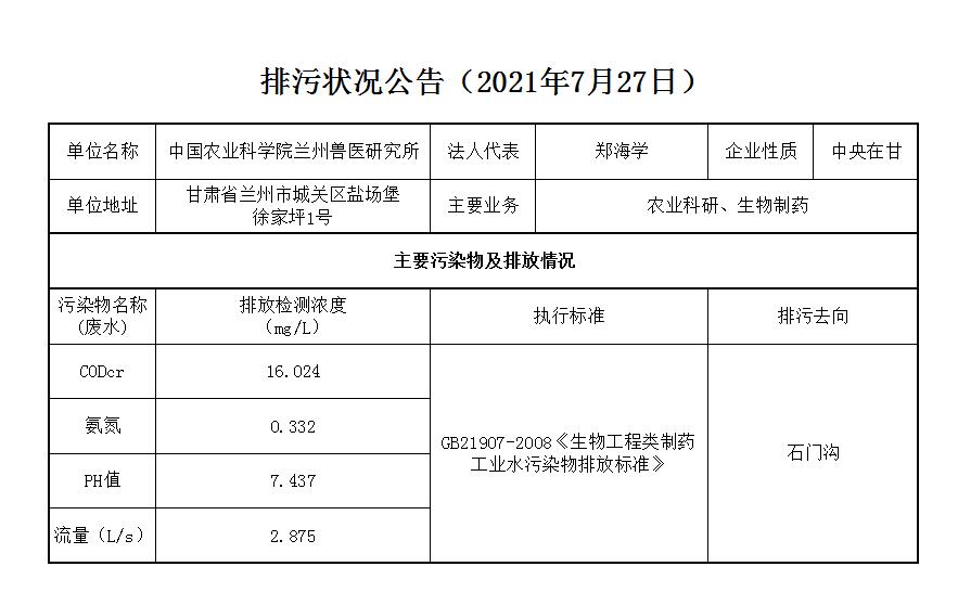 2021年7月27日污水排放监测数据公告