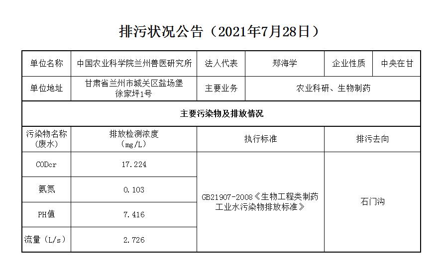 2021年7月28日污水排放监测数据公告