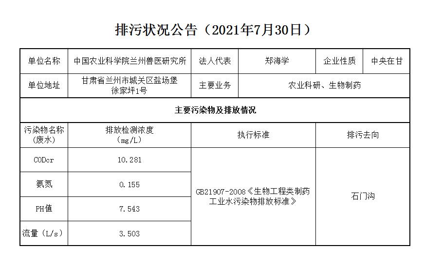 2021年7月30日污水排放监测数据公告